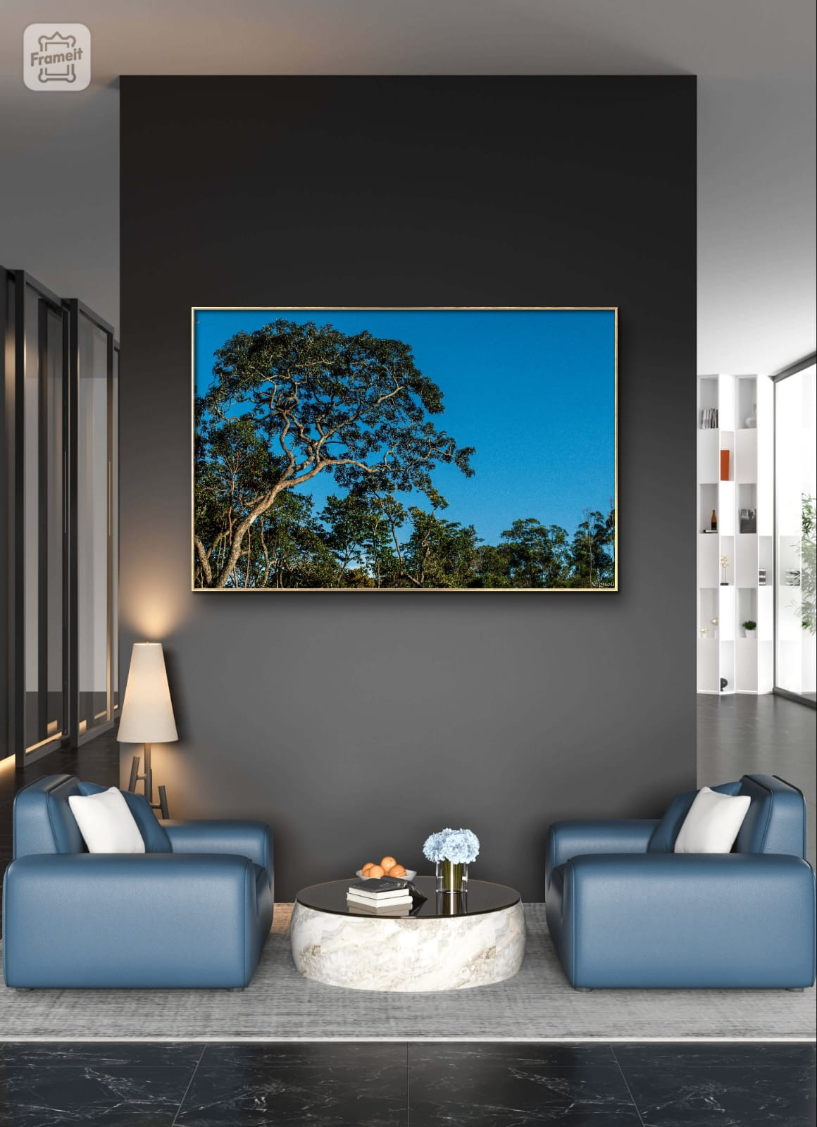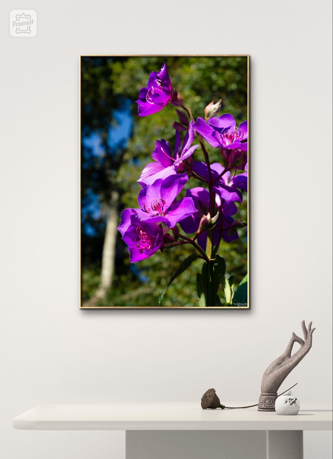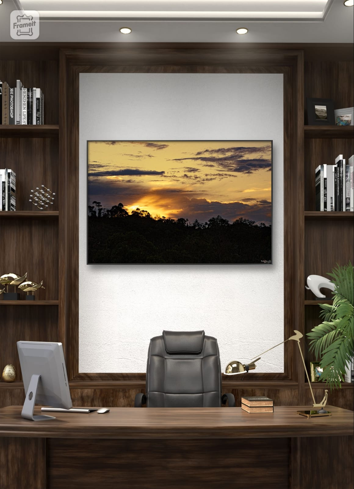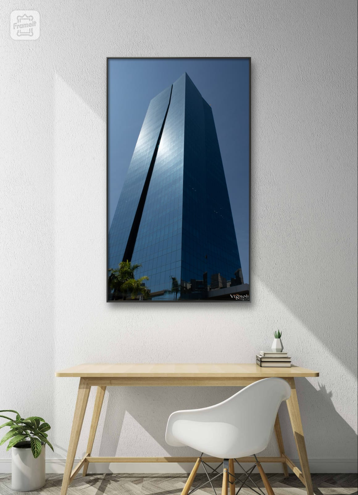 Impressão no Vidro: impressão direta no vidro com a mesma tecnologia ultra-violeta utilizada na madeira, trazendo uma leveza adicional à imagem com uma moldura que traz um aspecto 3D à obra.