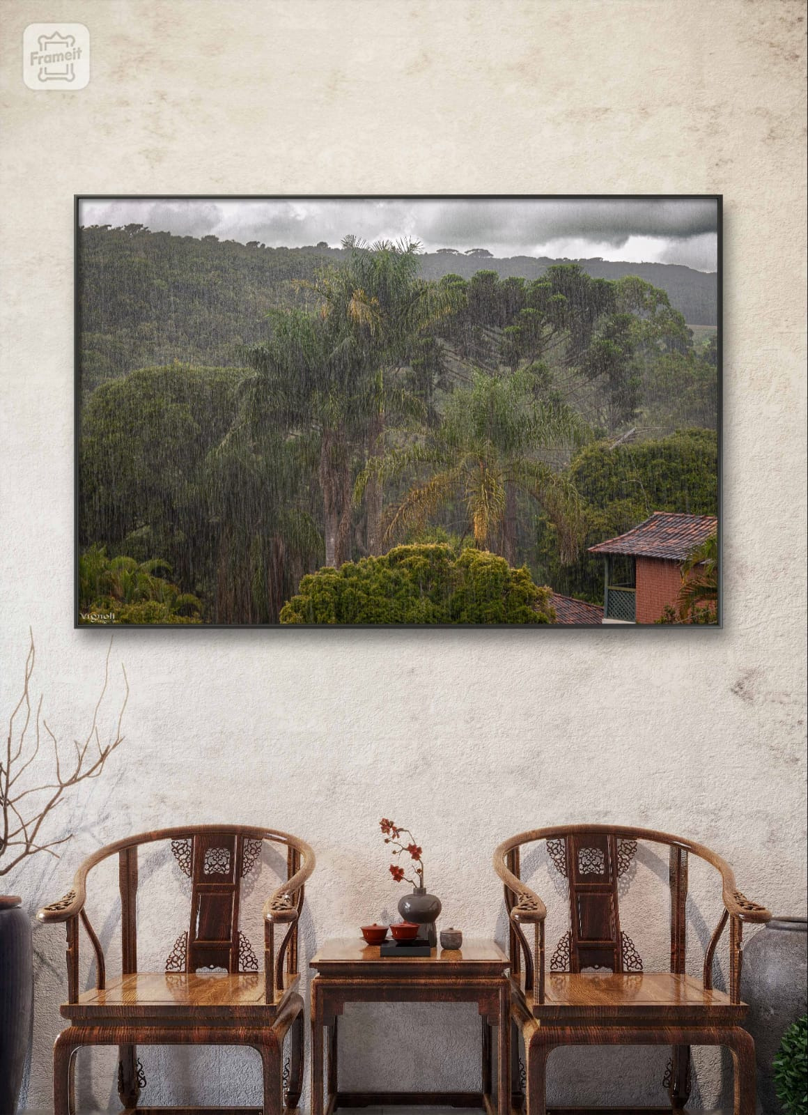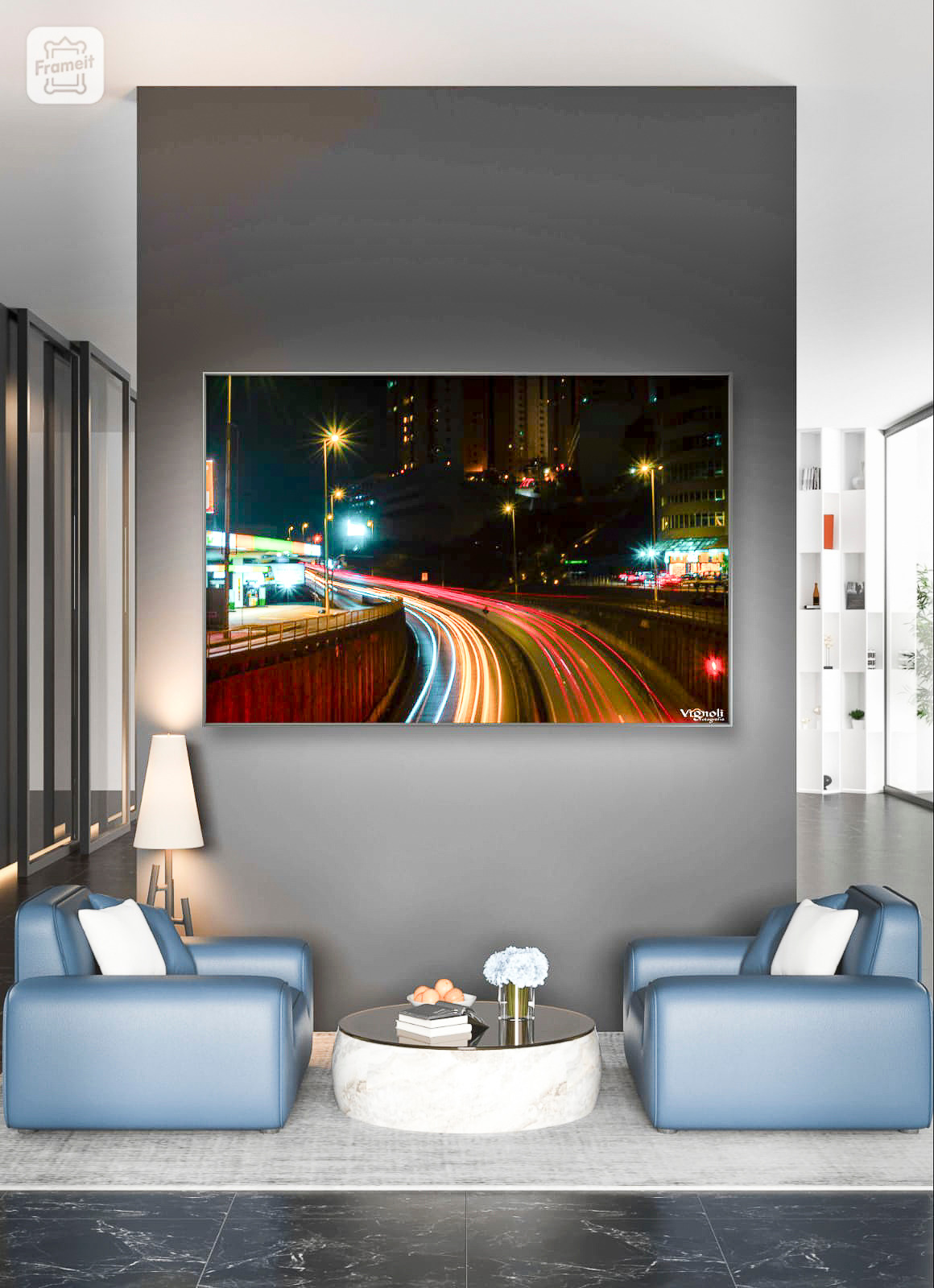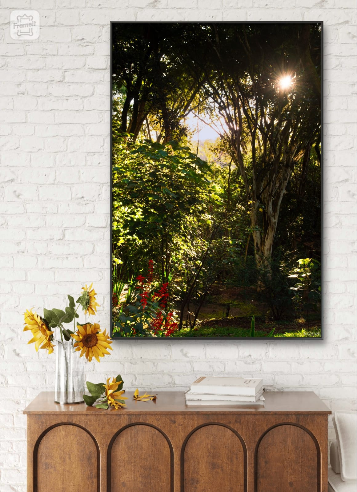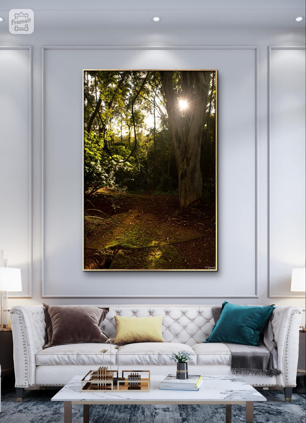 Impressão no Vidro: impressão direta no vidro com a mesma tecnologia ultra-violeta utilizada na madeira, trazendo uma leveza adicional à imagem com uma moldura que traz um aspecto 3D à obra.