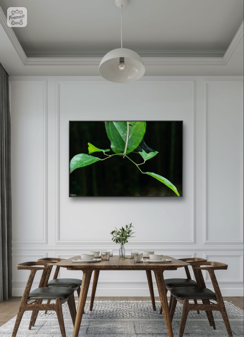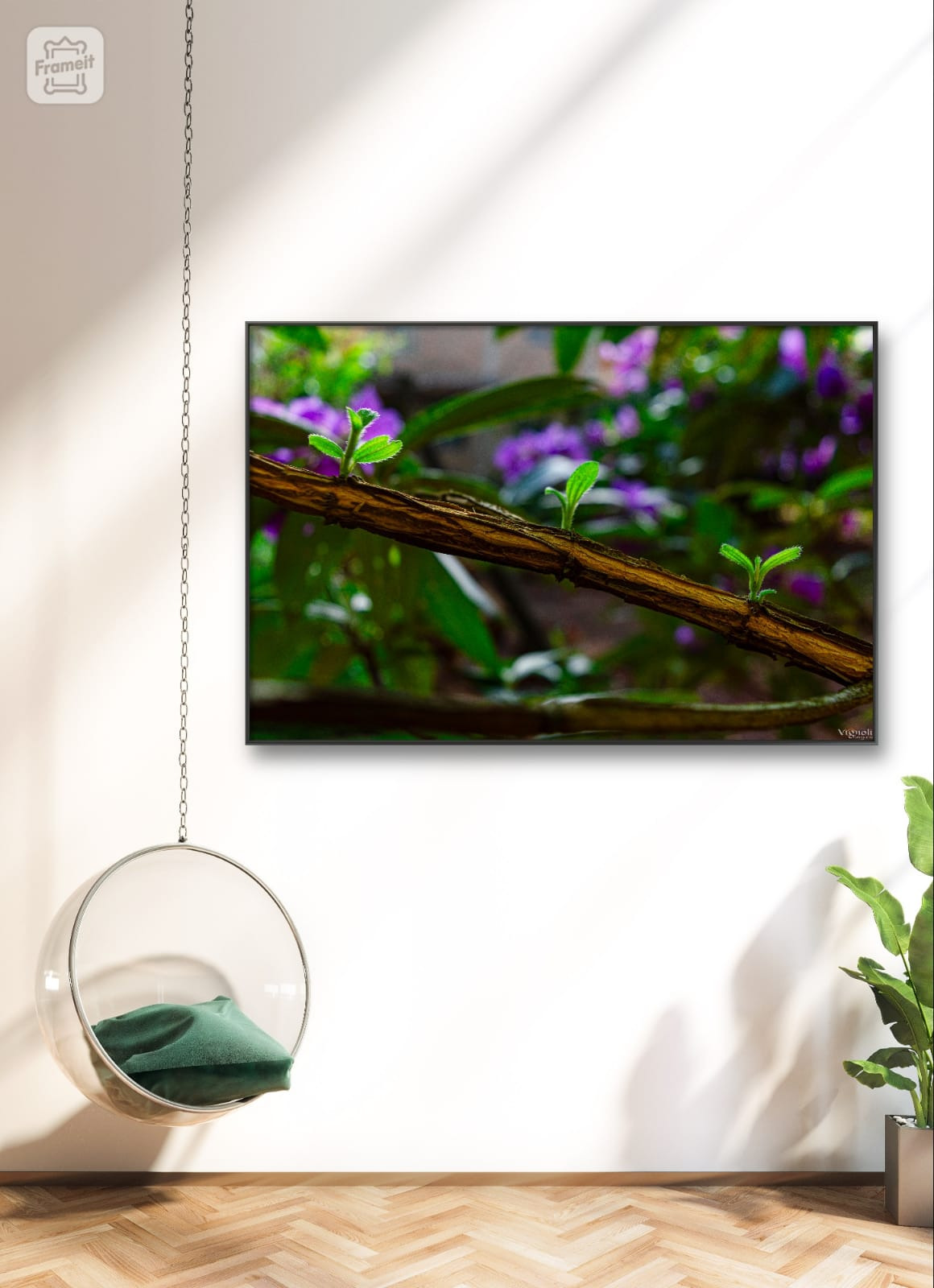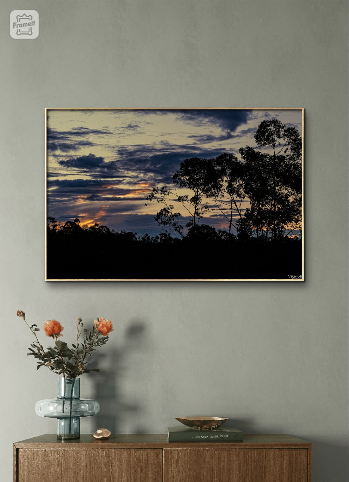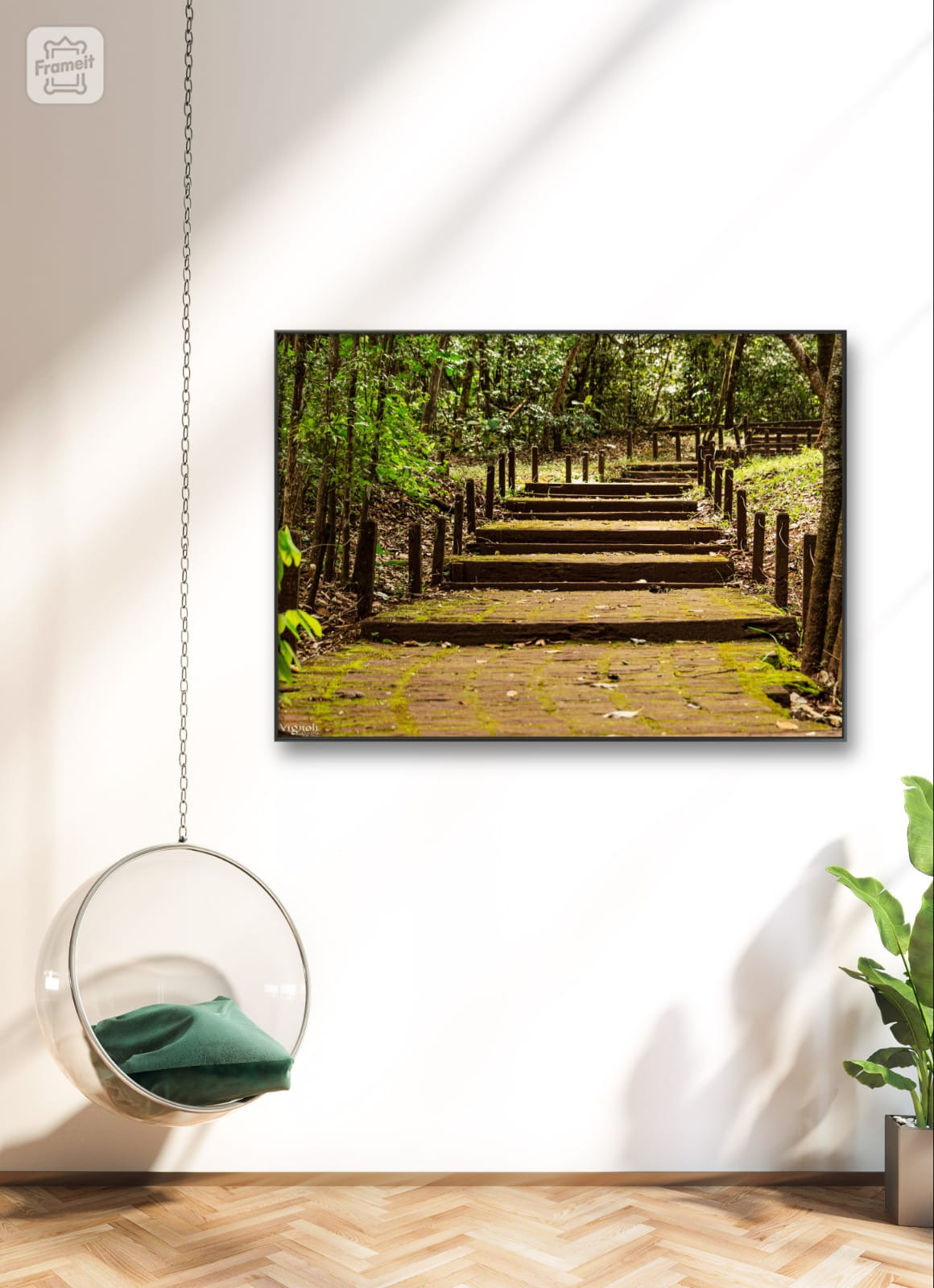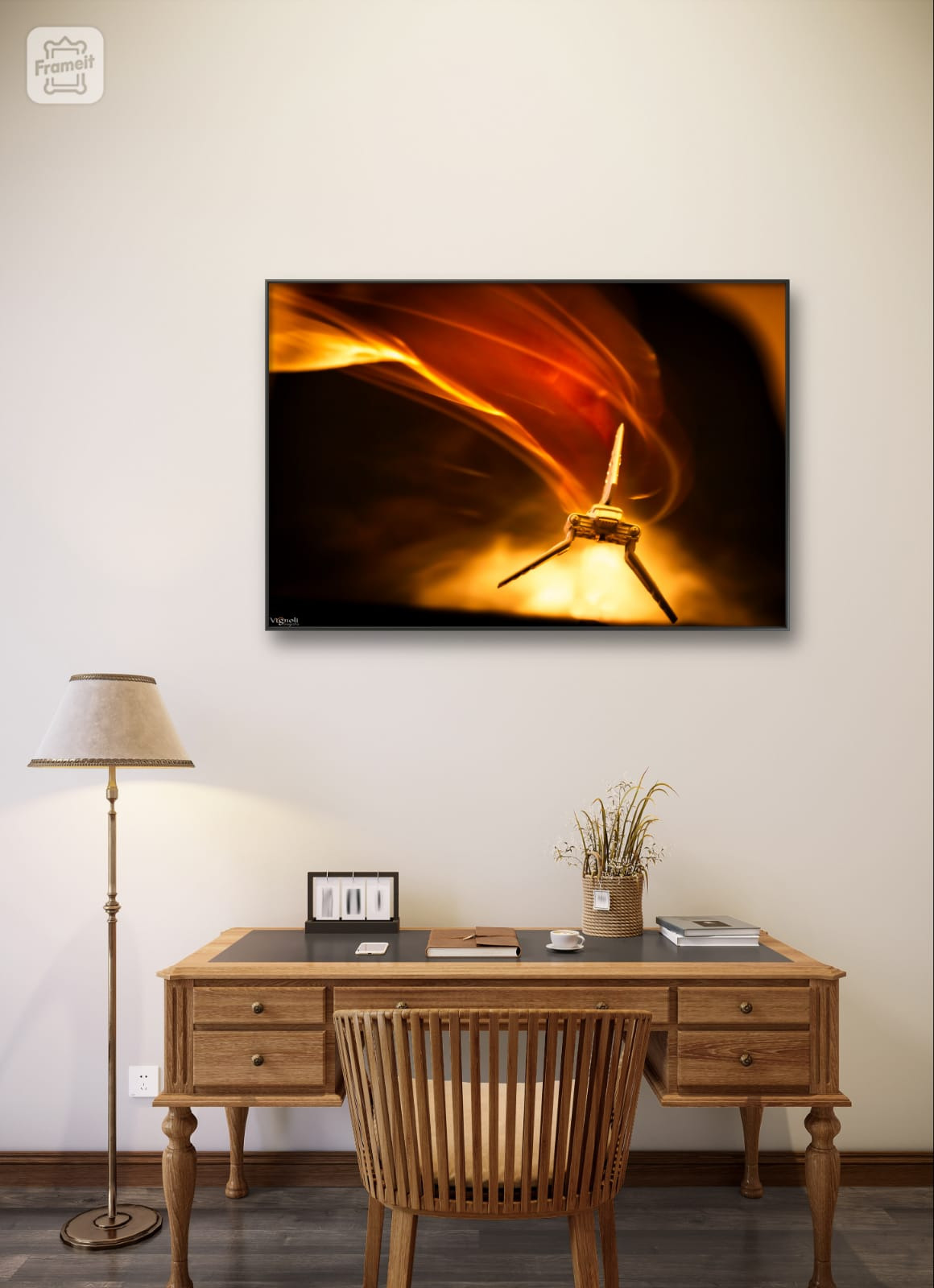 Impressão no Vidro: impressão direta no vidro com a mesma tecnologia ultra-violeta utilizada na madeira, trazendo uma leveza adicional à imagem com uma moldura que traz um aspecto 3D à obra.
